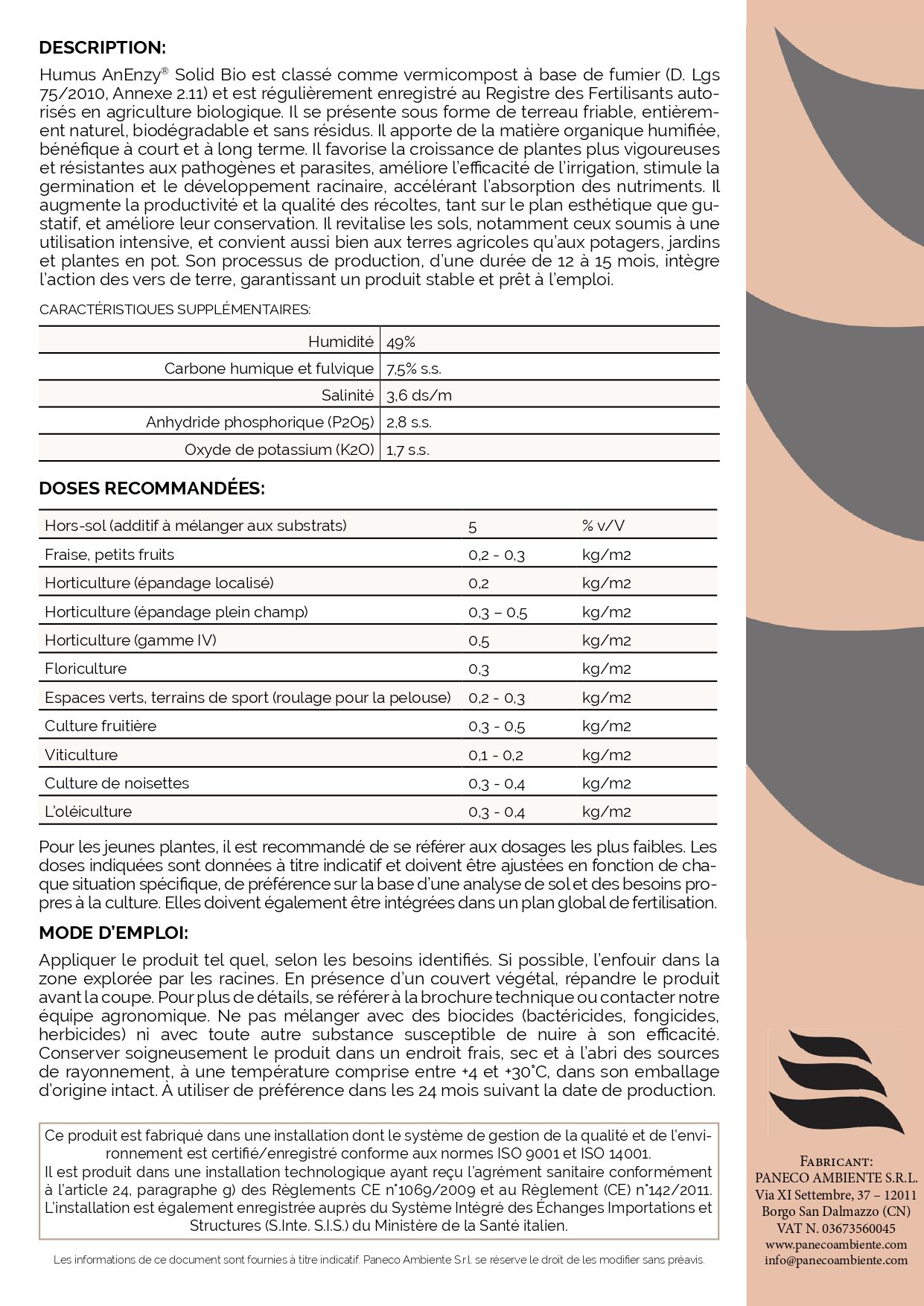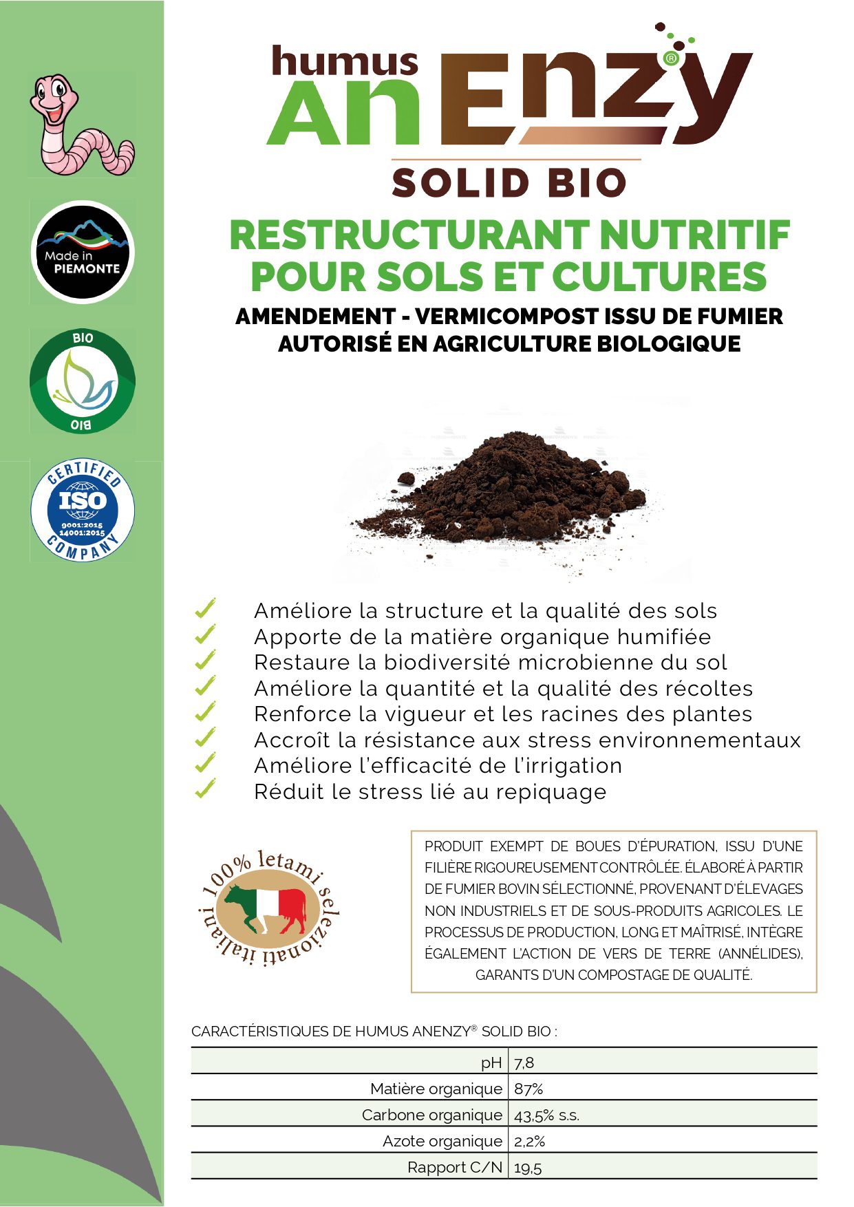• Compatibilité biologique: est un amendement organique certifié pour une utilisation en agriculture biologique (label AB).