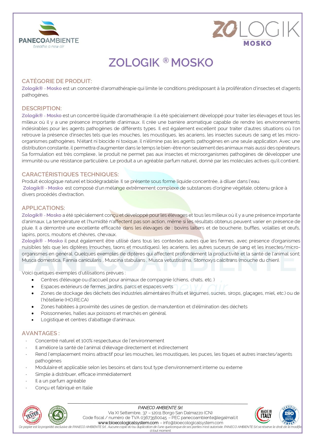 Zologik Mosko est un concentré aromathérapeutique biodégradable, élaboré pour repousser sans tuer mouches, moustiques, acariens et autres insectes indésirables. Sa formule complexe d’extraits végétaux crée une barrière olfactive inhospitalière pour les nuisibles, tout en respectant la santé humaine et animale.